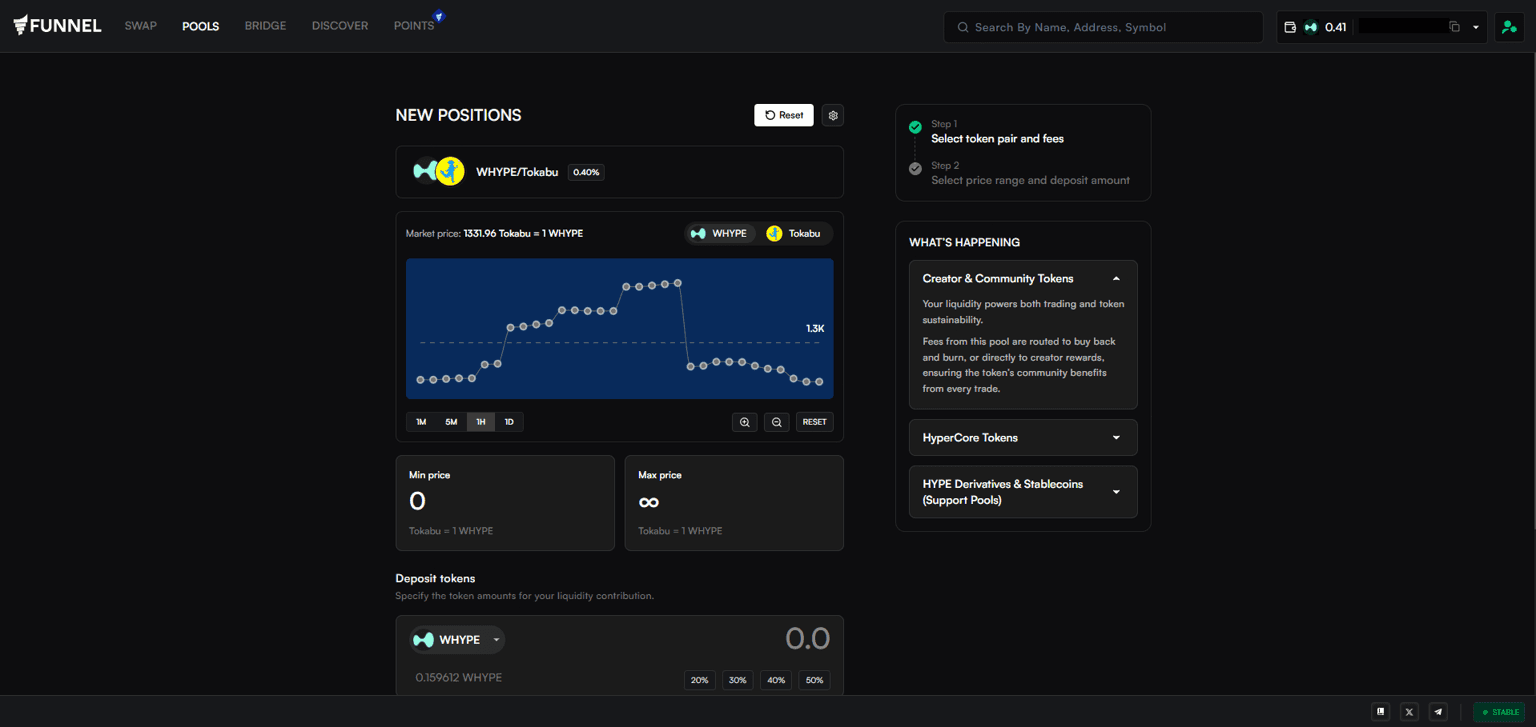 Both will navigate you to Create Positions, where you can select the desired pair, set a fee tier, set a price range, and enter the amount of tokens to deposit.