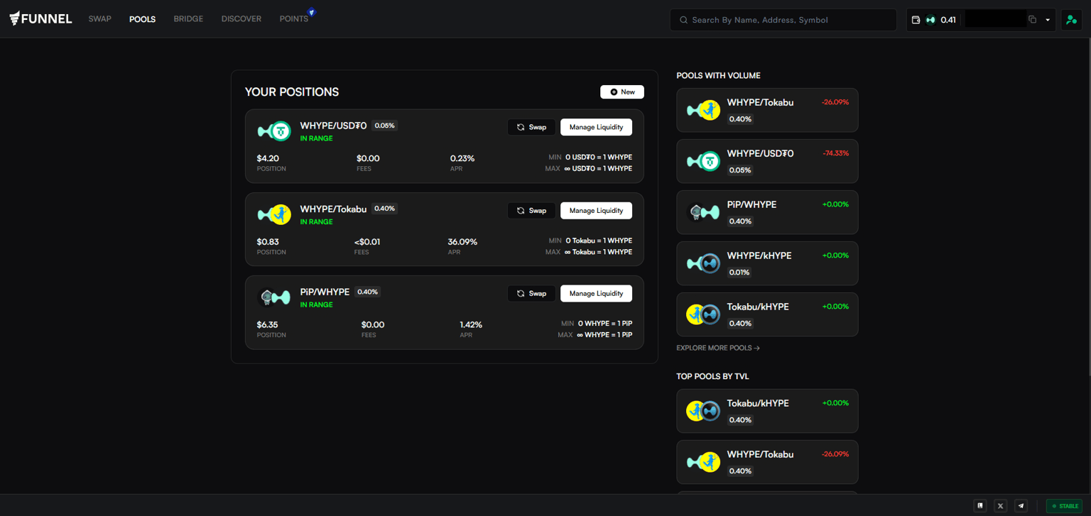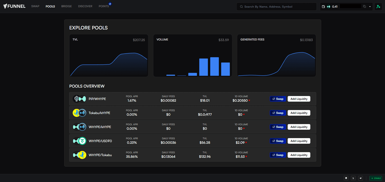 Explore Pools is where you can discover and analyze all available liquidity pools on Funnel. It provides an overview of key metrics like Pool APR, TVL, 24-hour volume, and total fees generated, allowing you to identify top-performing pools at a glance.