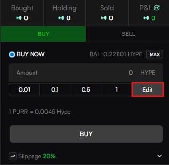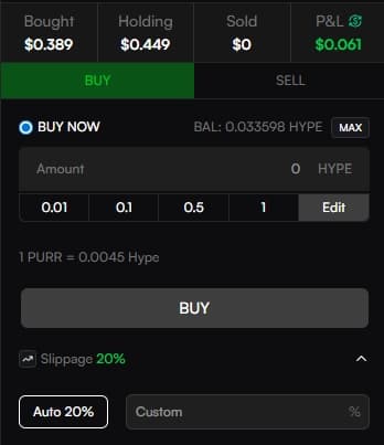 Custom Amount: For precise control, enter the amount of HYPE you wish to spend or the % of tokens you wish to sell.
